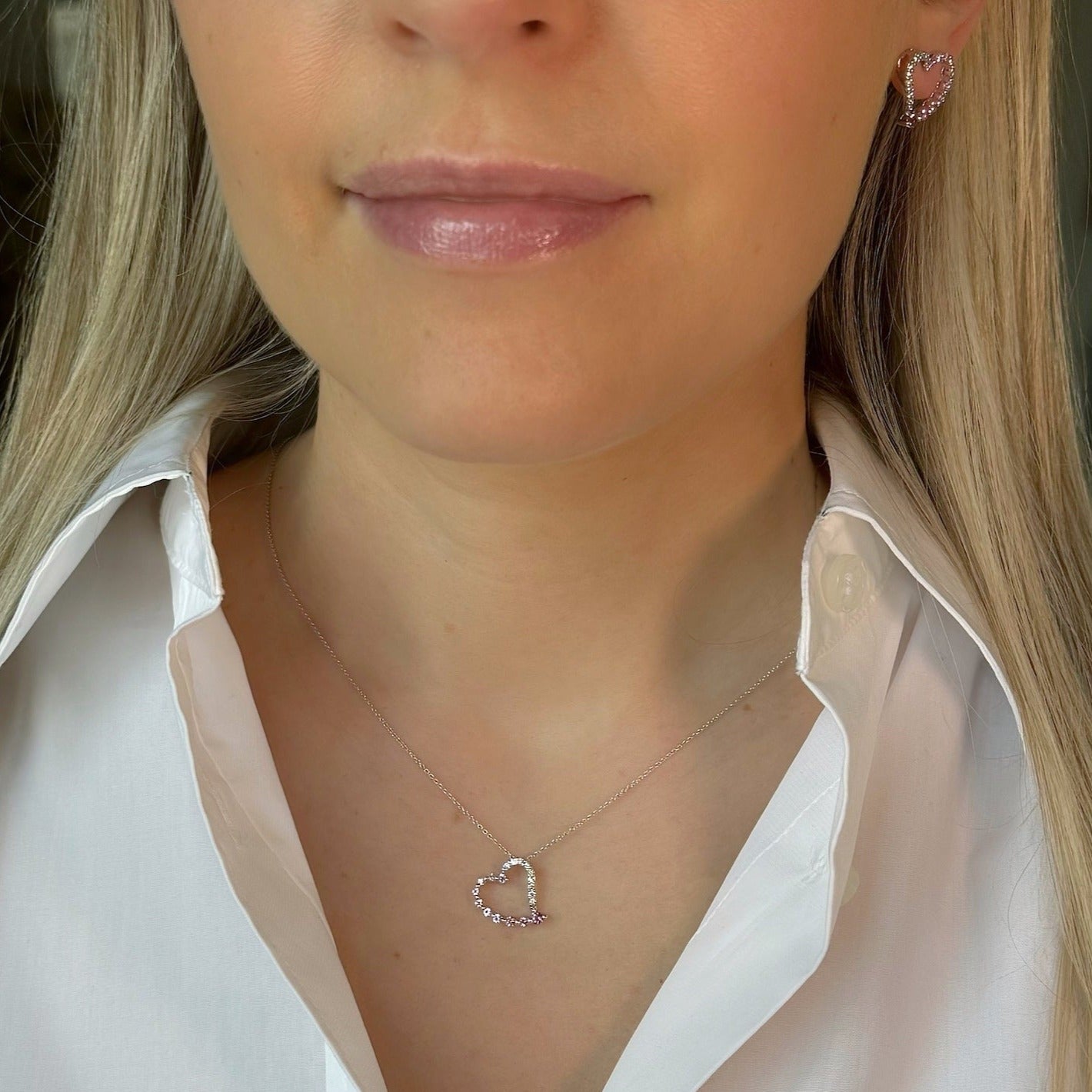 Diamond and pink sapphire heart necklace, set in 14K white gold