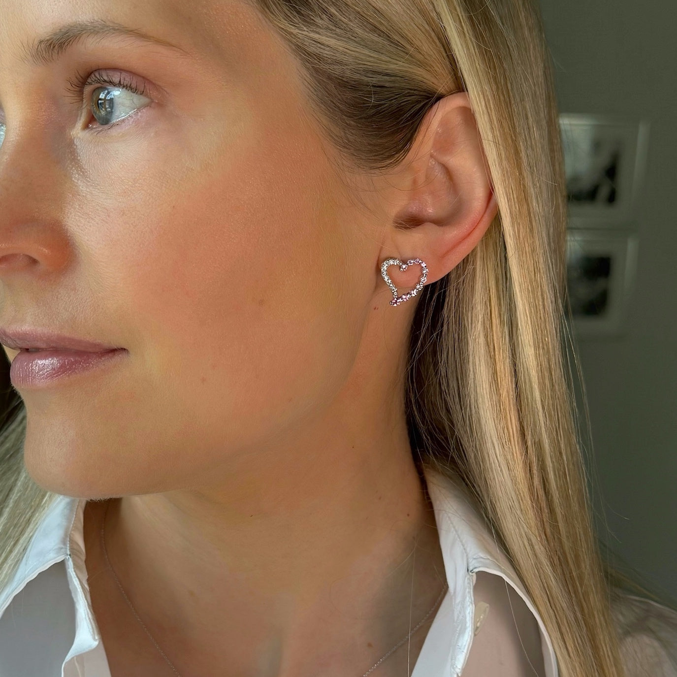 Pink tourmaline, spinel, sapphire and diamond heart shaped earrings, 14K white gold.