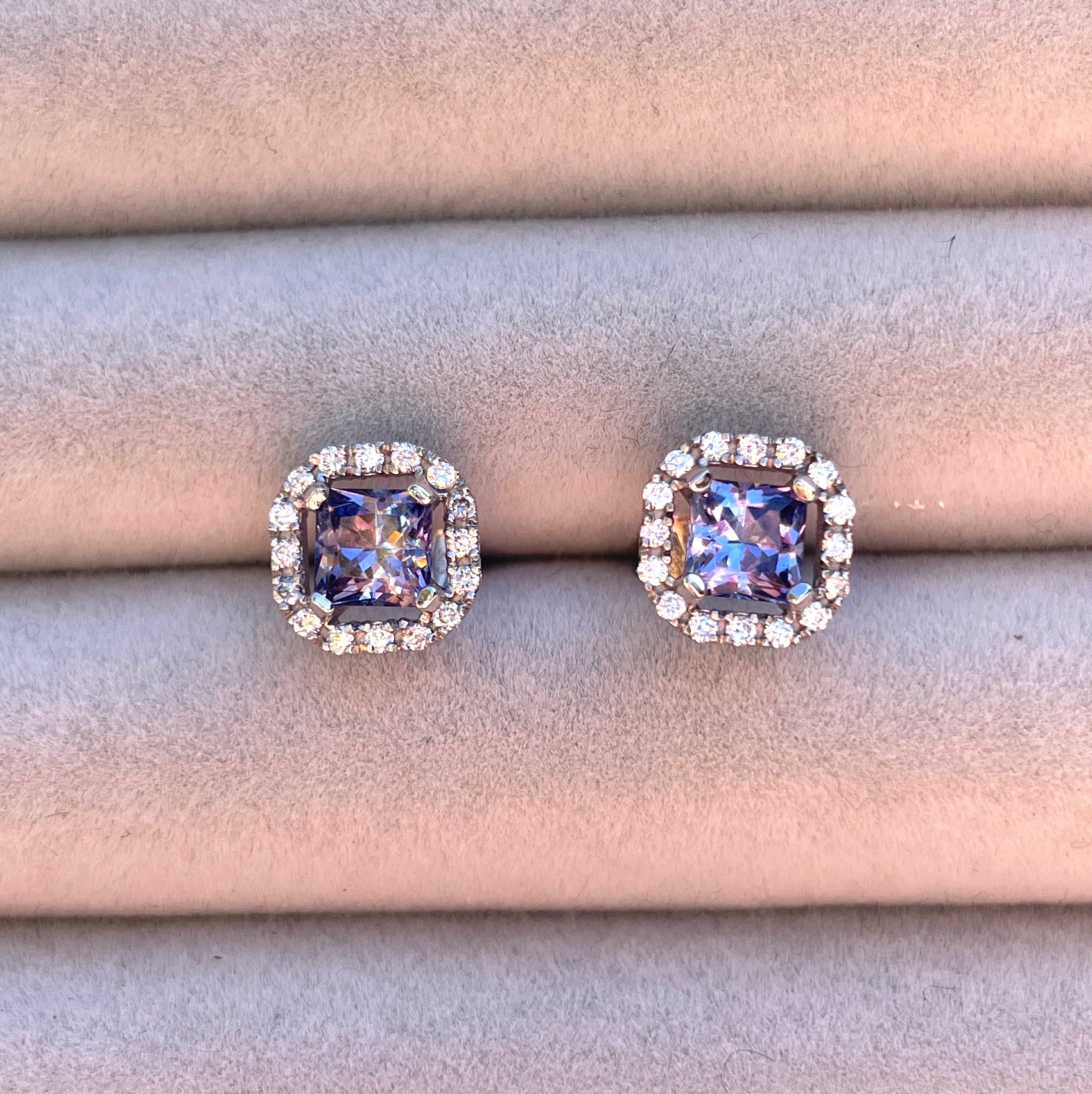 - 2 princess cut Madagascan lavender spinels, 0,90 tcw.